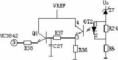 3、輸出限壓保護電路: 輸出限壓保護電路如下圖,當輸出電壓升高,穩壓管導通光耦導通,Q1基極有驅動電壓而道通,UC3842③電壓升高,輸出降低,穩壓管不導通,UC3842③電壓降低,輸出電壓升高。周而復始,輸出電壓將穩定在一范圍內(取決于穩壓管的穩壓值)。